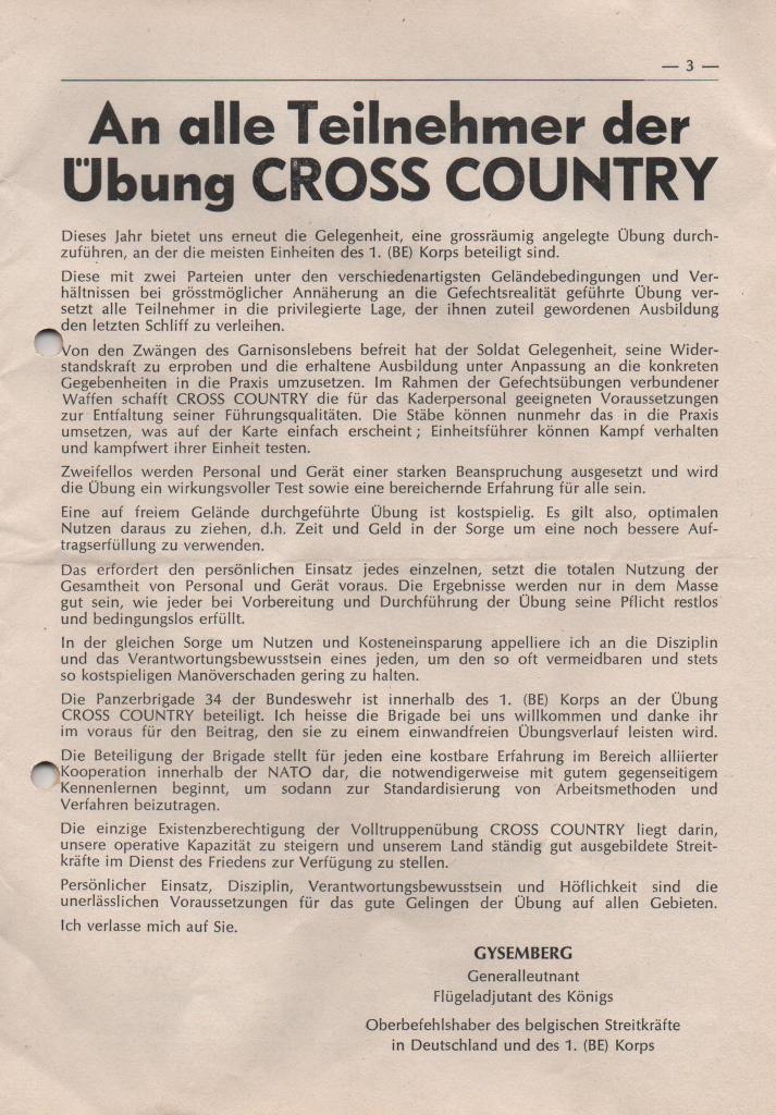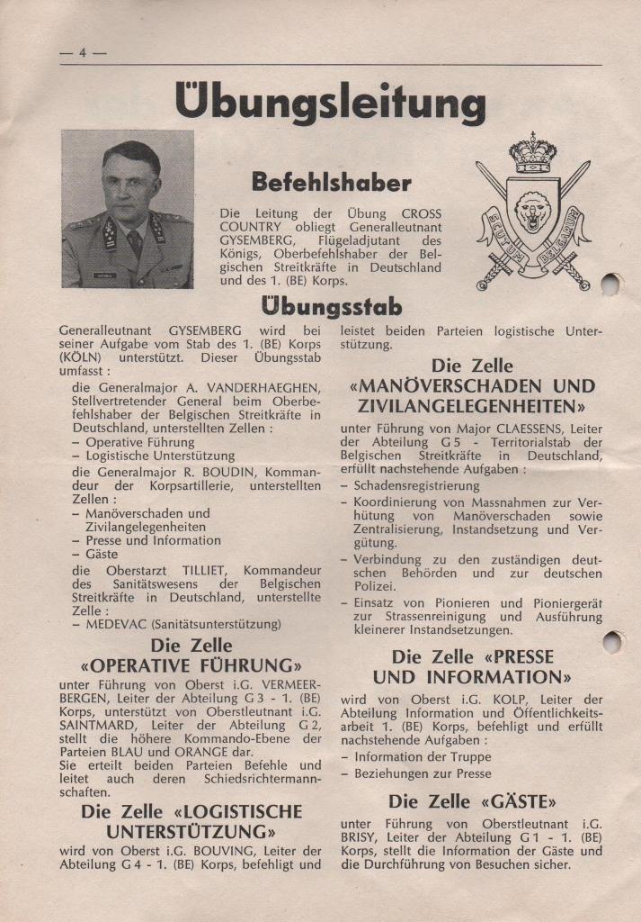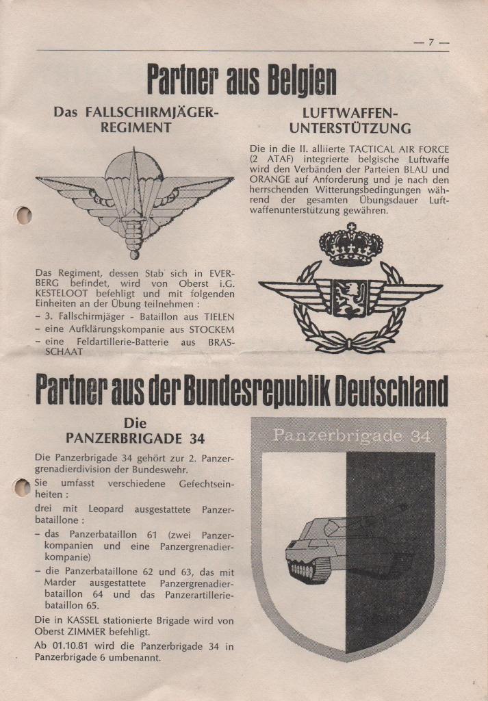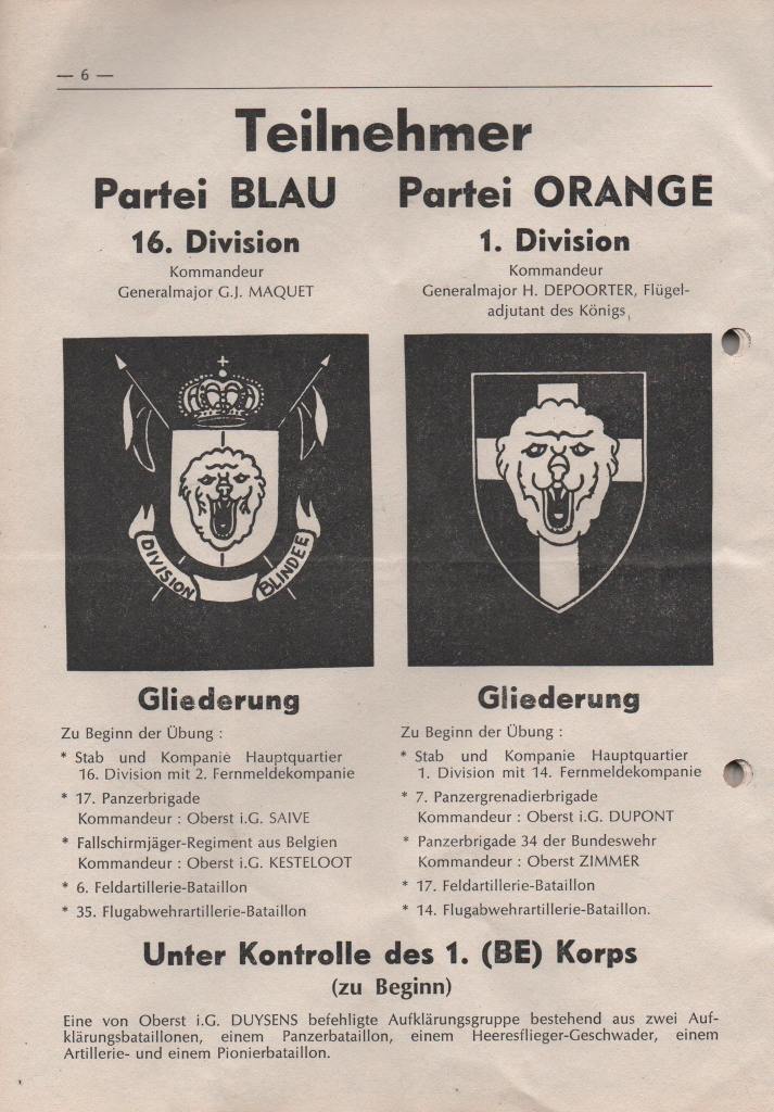 Nachfolgende Abbildungen der an die Übungsteilnehmer ausgehändigten Broschüre des 1. (BE) Corps mit allen Einzelheiten der Übung hat uns freundlicherweise Steffen Bühler zur Verfügung gestellt. Er hat damals als Soldat und Angehöriger des PzArtBtl 65 aus MENGERINGHAUSEN an der Übung teilgenommen.