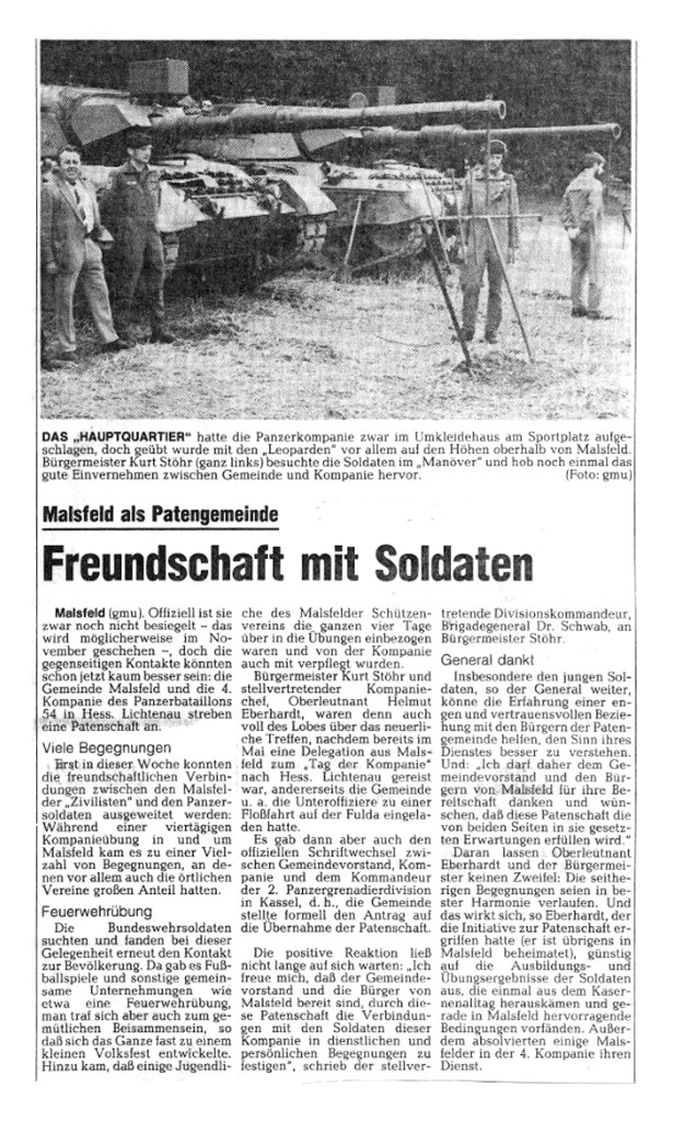 Patenschaft zwischen der 4.Kp PzBtl 54 und MALSFELD – Pressemeldung HNA vom 11.08.1984