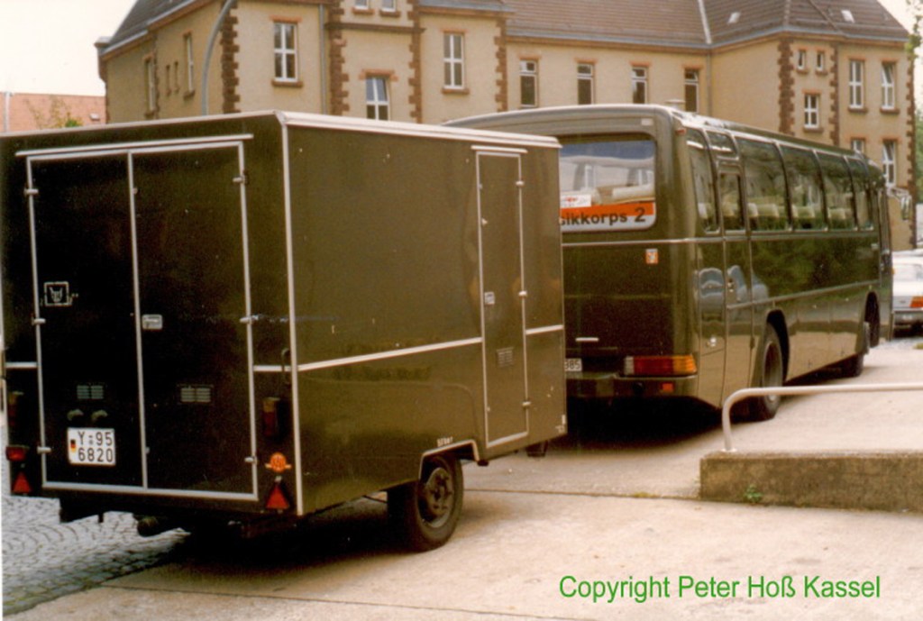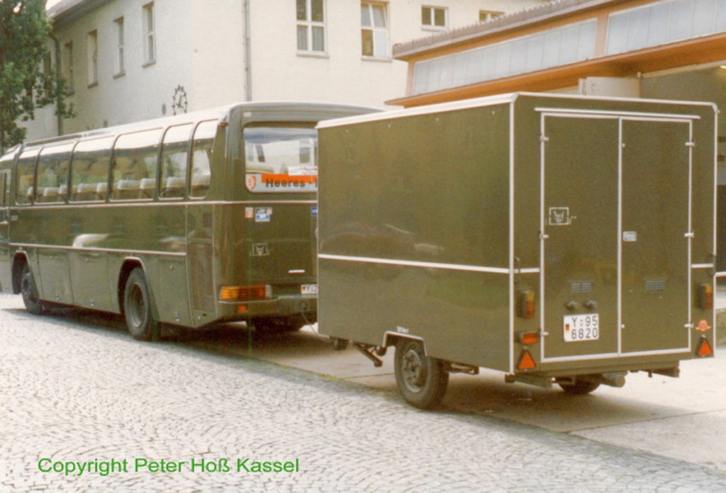 Mercedes BUS O303 des Heeresmusikkorps 2 mit Anhänger zum Instrumententransport vor den KfzHallen in der Jäger-Kaserne.