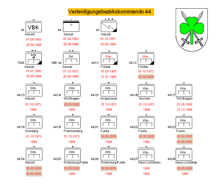Stab (gekadert) / Stabskompanie VBK 44 (GerEinh) Stabsoffizier für Reservistenangelegenheiten bei VBK 44 Verbindungsorganisation alles GerEinh): Verbindungskommando (NATO) 44/1 Verbindungskommando (NATO) 44/2 Verbindungskommando (ZivBeh) 44/01 Fernmeldezug 44 (GerEinh) Infrastruktur- und Bauinstandsetzungsgruppe 7044 (GerEinh) Pionierdienstgruppe VBK 44 mit unterstellten 17 Wallmeistertrupps