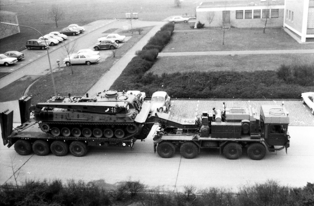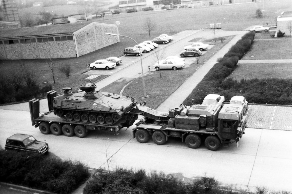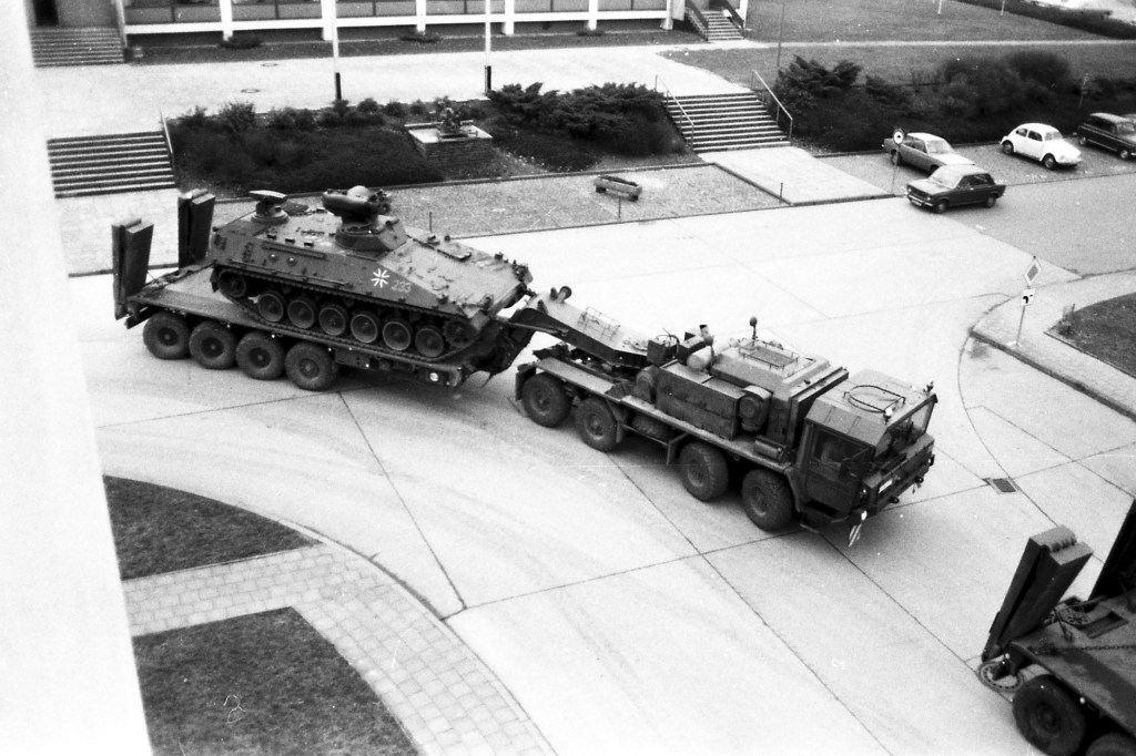 Nachfolgende Fotos wurden aus dem Fenster des Unterkunftsgebäudes der 5./FlaBtl 2 aufgenommen und zeigen Schwerlasttransporter SLT 50-2 der 5./InstBtl 2 beim Abtransport von Großgerät aus der Hindenburg Kaserne in die Heimatstandorte nach einem Tag der offenen Tür im Sept. 1976. Fotos copyright Peter Hoß