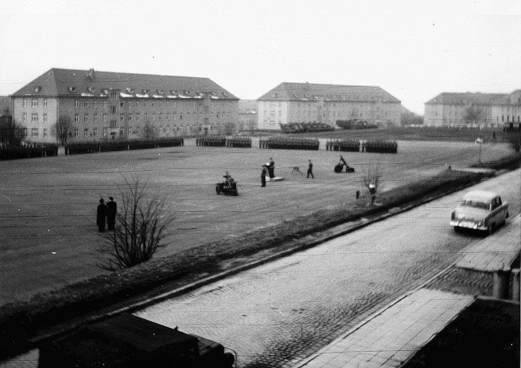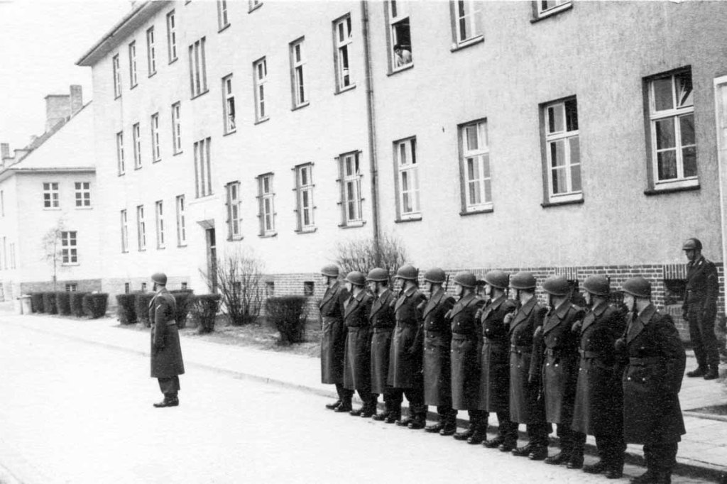 Foto: 1961 Antreten zur Formalausbildung der Panzeraufklärungskompanie 40 vor dem Kompaniegebäude in der Zieten-Kaserne (Foto H.Guthof)