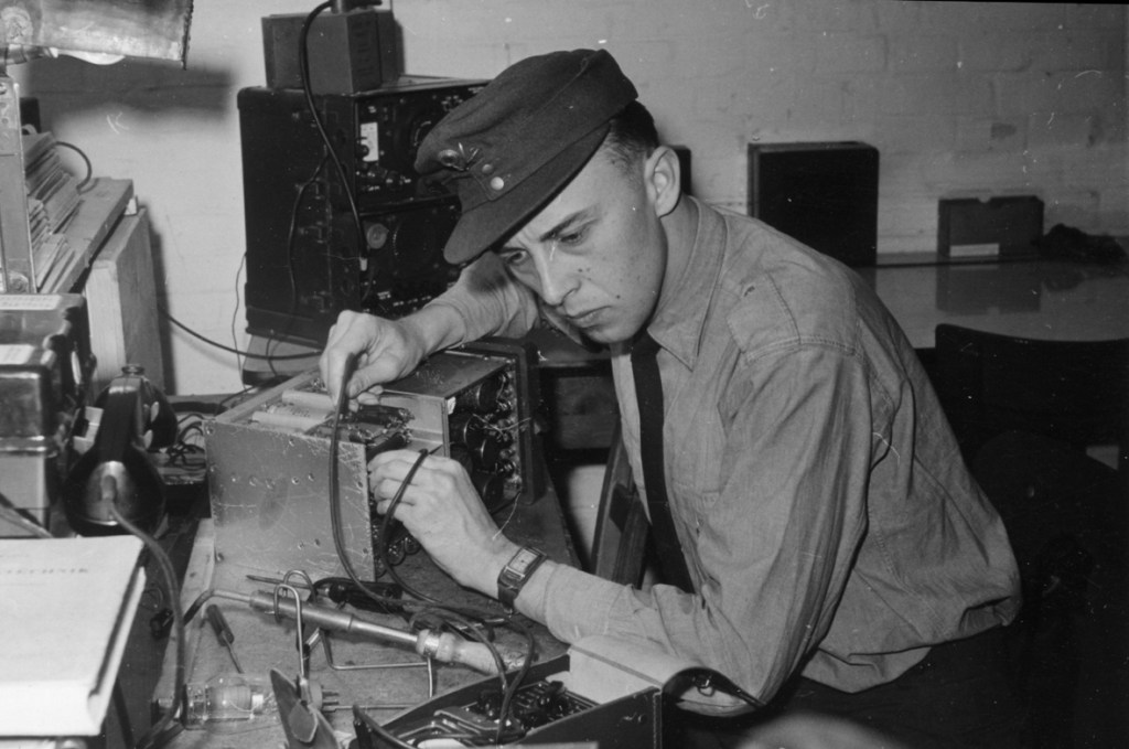 Foto: Instandsetzung von Fernmeldegerät im Keller eines Gebäudes der Zieten-Kaserne, eingerichtet als behelfsmäßige Fernmeldewerktstatt (Foto H.Lange).
