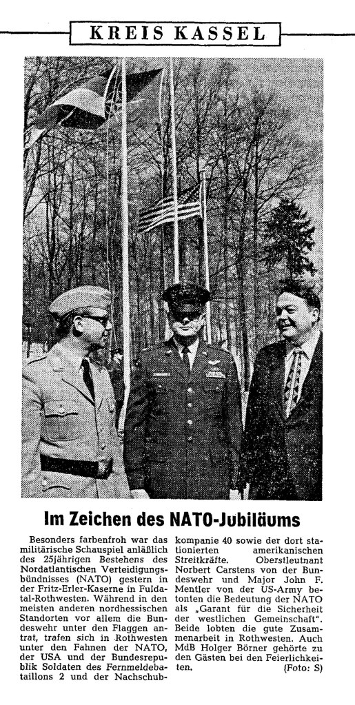 Am 4.April 1974 traten in Rothwesten unter den Flaggen der Nato, der USA und der Bundesrepublik deutsche und amerikanische Soldaten anläßlich des 25jährigen Bestehens der Nato an. Die Abordnungen der Bundeswehr wurde gestellt durch Soldaten des Fernmeldebataillon 2 und der Nachschubkompanie 40. In ihren Reden würdigten der Kdr des FmBtl 2 Oberstleutnant Carstens und der Kommandeur der US Army Major F.J.Mentler die gute Zusammenarbeit in Rothwesten, siehe auch nachfolgende Pressemeldung Hessischen allgemeinen Ausgabe Kreis Kassel vom 05.04.1974.