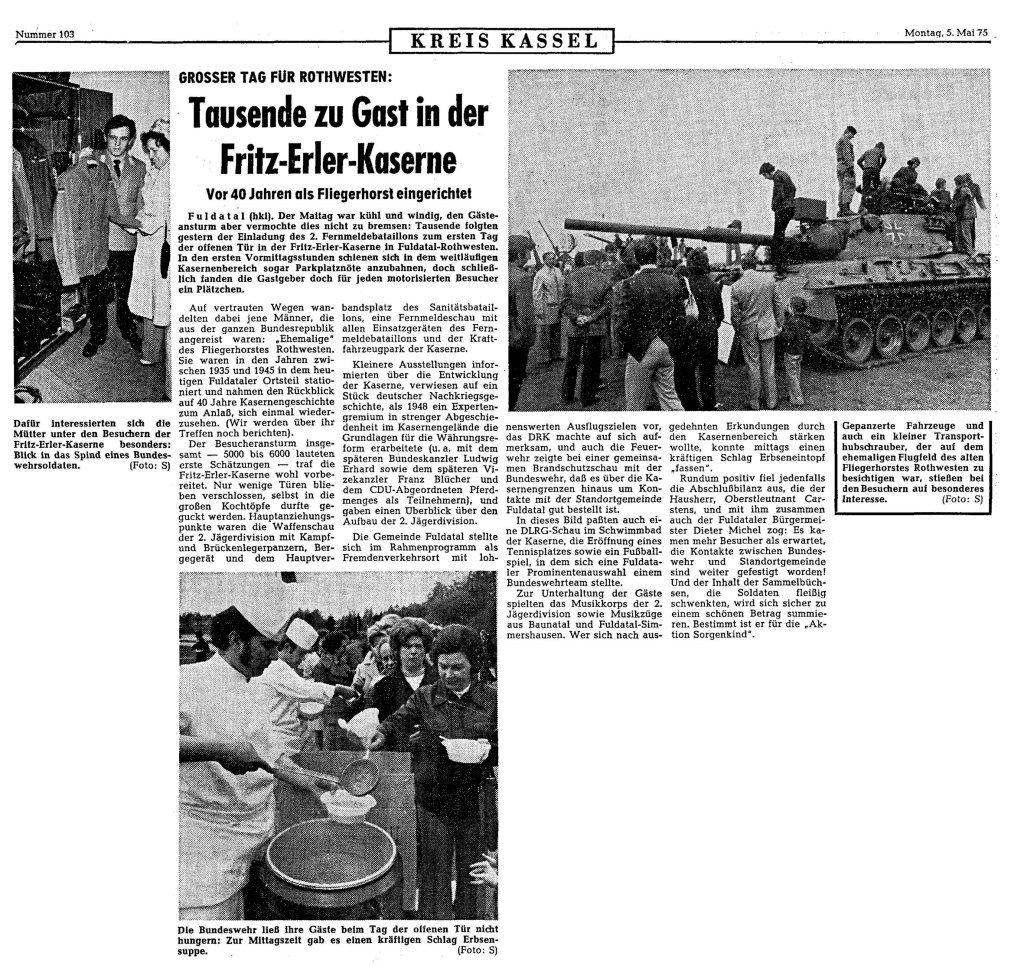 Am 04. Mai 1975 fand in der Fritz-Erler-Kaserne, unter reger Anteilnahme der Bevölkerung, der erste Tag der offenen Tür der in der Kaserne stationierten Bundeswehr Einheiten Fernmeldebataillon 2 und Nachschubkompanie 40 statt.