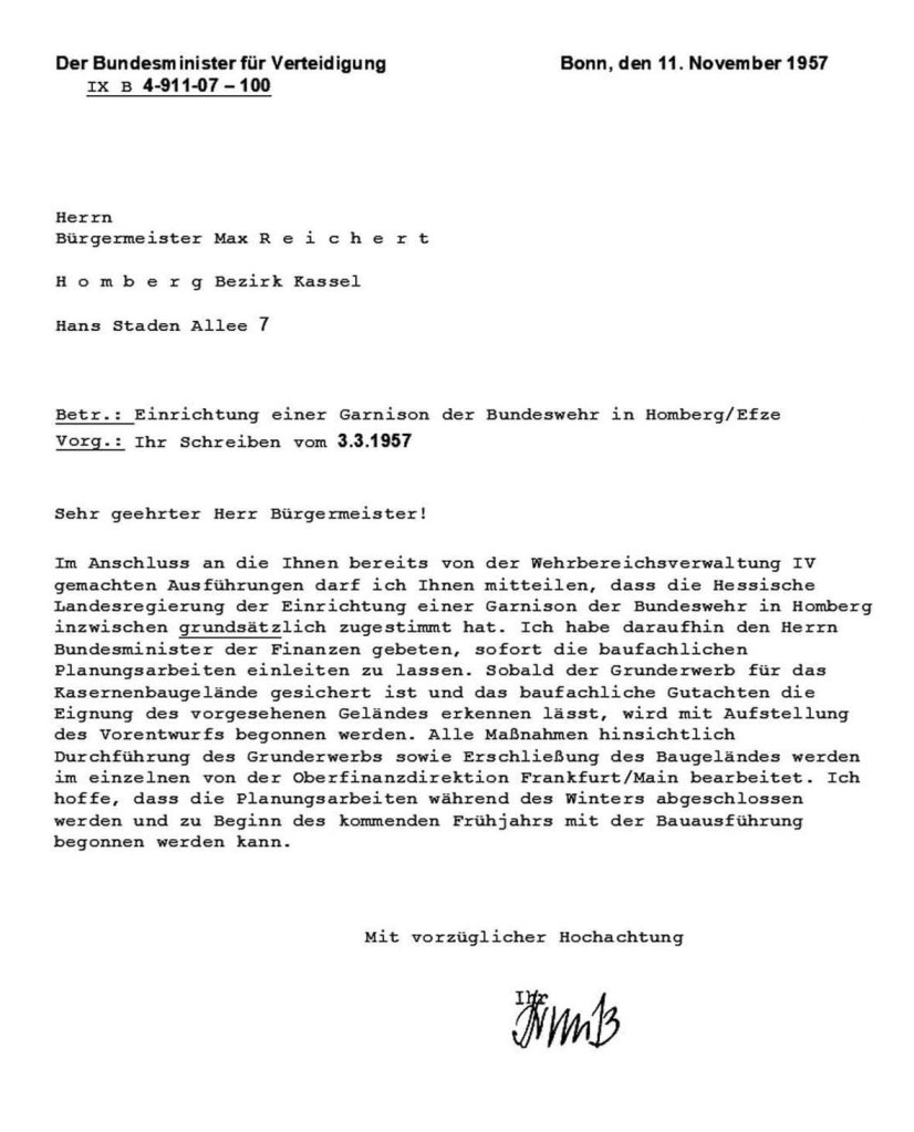 Angefügt zwei Antwortschreiben an den Bürgermeister Stadt Homberg/Efze des Bundeskanzleramtes vom 21.01.55 und darunter eine Antwort des Bundesministeriums der Verteidigung vom 11. November 1957. Es zeigt an diesem Beispiel wie früh sich die kommunalen Verantwortungsträger um die Errichtung einer Stationierung der Truppe beworben und bemüht haben.