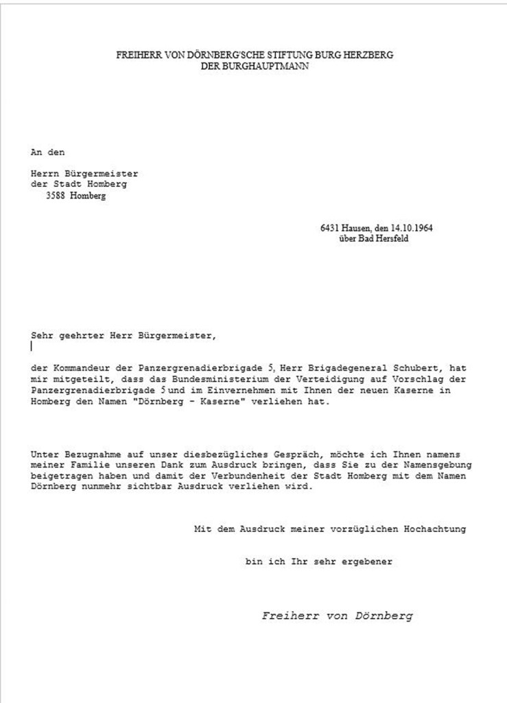 Schreiben mit der Zustimmung zur Namensgebung der Kaserne durch die „Freiherr von Dörnbergsche Stiftung Burg Herzberg der Burghauptmann“ vom 14.10.1964
