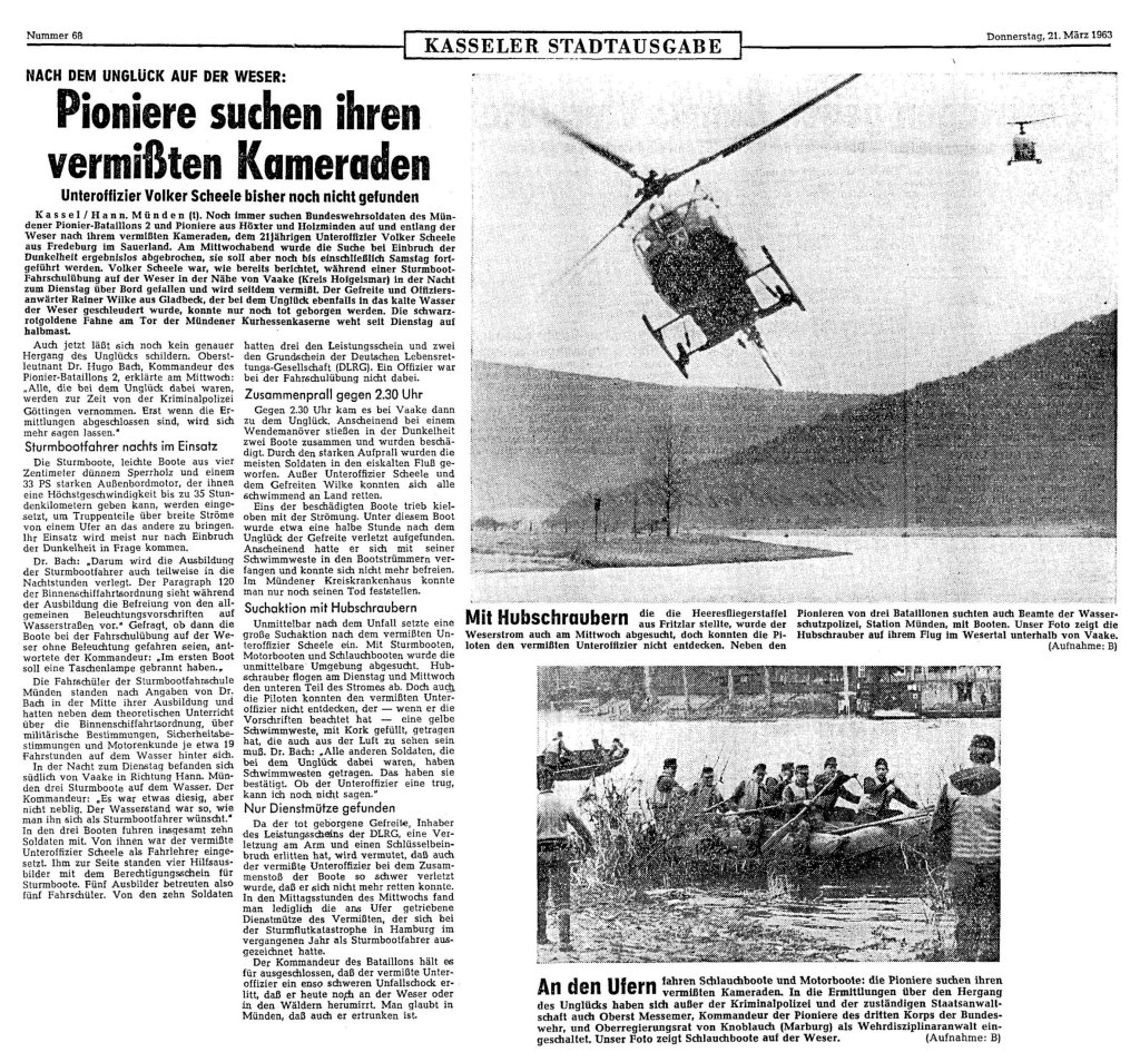 In der Nacht zu Dienstag dem 19.März stießen im Rahmen der Ausbildung von Sturmbootfahrern der 4.Kompanie des Pionierbataillon 2 aus Hannoversch-Münden auf der Weser in der Nähe von VAAKE Kreis Hofgeismar zwei Boote zusammen. Dabei konnte ein Soldat nur noch tot geborgen. Ein weiterer Soldat wurde zunächst vermisst und mehrere Tage gesucht. Der Leichnam des Vermissten wurde am Karfreitag dem 22.März 1963 bei Lippoldsberg aus der Weser geborgen. Die Hessische Allgemeine in Kassel berichtete über das Unglück, siehe angehängten Presserartikel vom 22. März 1963.