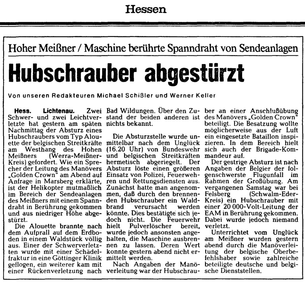 Absturz eines belgischen Hubschraubers Typ ALOUETTE am 22.September 1988 während des Manövers „Golden Crown“ am Westhang des Hohen Meissner. Die Maschine berührte dabei die Spanndrähte des Sendemastes am Hohen Meissner, stürzte ab und brannte am Boden aus. Das Unglück forderte zwei Schwer-und zwei leichtverletzte Soldaten in Krankenhäuser in Göttingen und Bad Wildungen eingeliefert. Siehe angefügte Pressemeldung der HNA Ausgabe Hessen vom 23.09.1988