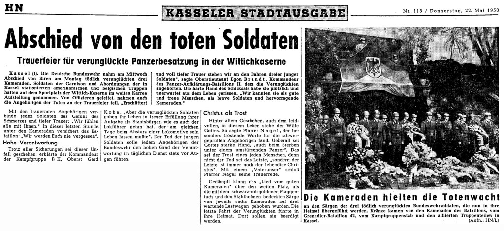 Beim Rückmarsch der Spähkompanie 1 des Panzeraufklärungsbataillons 2 vom Übungsplatz Dönche Kassel zur Wittich-Kaserne in Kassel, kam es am 19.Mai 1958 zu einem folgenschweren Unfall mit einem leichten Kampfpanzer 41. Der ins rutschen gekommene Panzer stürzte um und begrub drei Soldaten uner sich. Alle drei erleitten dabei tödliche Verletzungen. Siehe anhängende Pressemeldung der Hessischen Nachrichten Stadtausgabe Kassel vom 20. Mai 1958.