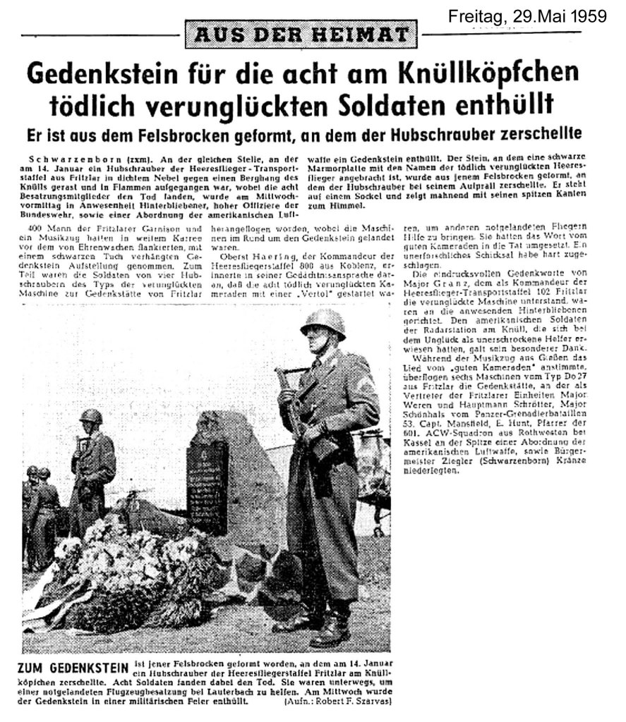 Am 14.Januar 1959 stürzte ein Bundeswehr Hubschrauber vom Typ Vertol H 21 („fliegende Banane“) der Heeresfliegerstaffel 822 aus Fritzlar im Knüllgebirge nahe Schwarzenborn ab. Das Unglück geschah bei Nebel und dichtem Schneegestöber zwischen 11:30 und 11:40 Uhr Uhr am Knüllköpfchen, der mit 632m höchsten Erhebung des Knüllgebirges. Acht Soldaten kamen bei dem Unglück ums Leben.