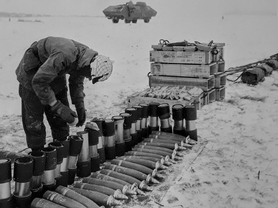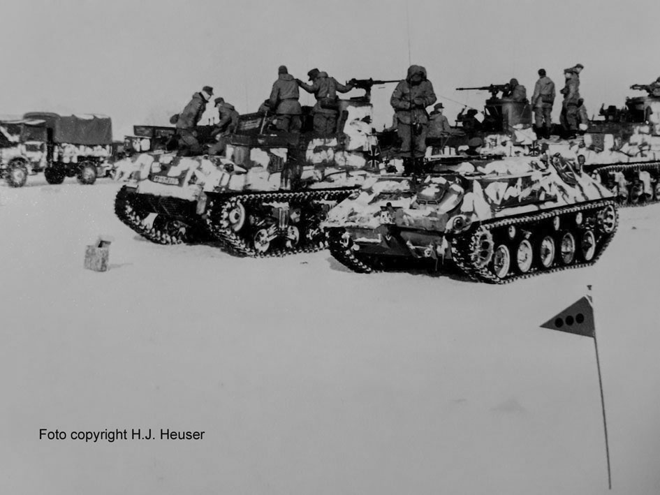Es war der kälteste Winter des 20. Jahrhunderts. Eine Kältewelle hatte Mitteleuropa vom 9.12.1962 bis zur ersten Märzwoche 1963 fest im Griff. Der Rhein und der Main waren zugefroren, große Eisplatten mussten gesprengt werden. Die Versorgungslage wurde teilweise kritisch. Das Panzerartilleriebataillon 65 aus Stadtallendorf hatte im Rahmen der Panzerbrigade 6 aus Neustadt einen Truppenübungsplatz Aufenthalt im tiefverschneiten Münsingen auf der Schwäbischen Alb im Februar. Bei einer Nachtübung wurden 31° minus gemessen. Trotz der warmen Kleidung, lange Unterwäsche, Trainingsanzug und Kampfanzug kam es zu Erfrierungen. Herbeigesehnt wurde nach der langen, sternklaren Nacht der Sonnenaufgang der Wärme mit sich brachte und die Rückfahrt in die ofenbeheizten Baracken des Lagers. Bilder: Fahrzeuge der 3.Batterie mit Panzerhaubitze M7B2, 105 mm Kaliber. Der Batteriechef war Hauptmann Hans Hoster, heute pensionierter Generalmajor, Alle Bilder copyright H.J.Heuser.